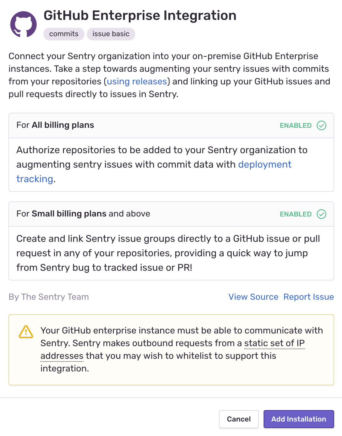 GitHub Enterprise should now be enabled for all projects under your Sentry organization.
