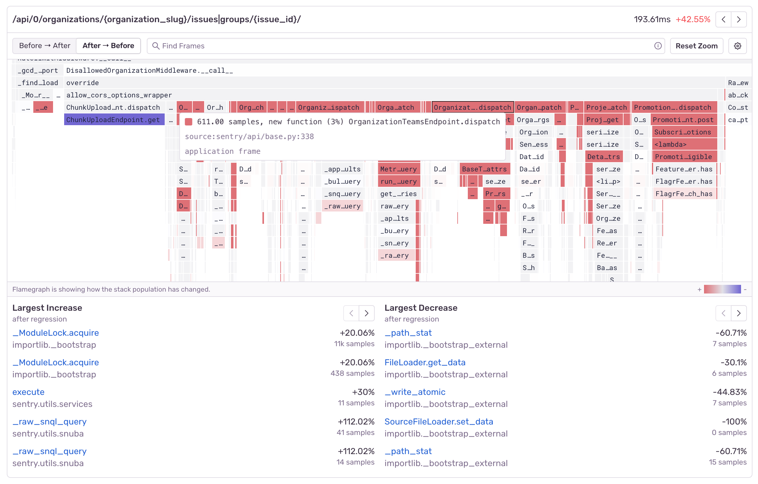 The above differential flame graph shows that new function calls to OrganizationTeamsEndpoint.dispatch